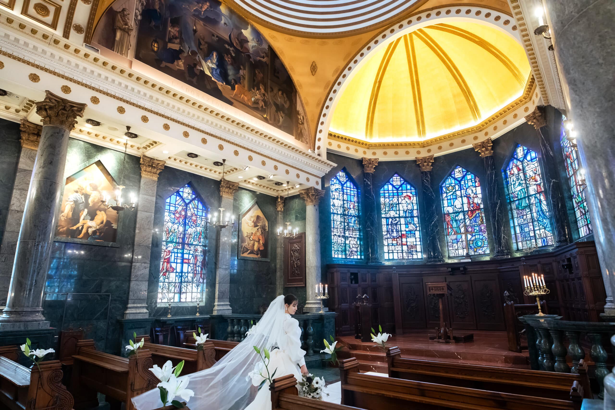 【 非日常に包まれた宮殿 】200年前のステンドグラスが輝く正統派な大聖堂、大理石であしらわれた重厚感のある館内は招待されたゲストを魅了する空間に♪