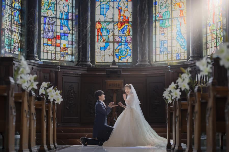 【 非日常に包まれた宮殿 】200年前のステンドグラスが輝く正統派な大聖堂、大理石であしらわれた重厚感のある館内は招待されたゲストを魅了する空間に♪